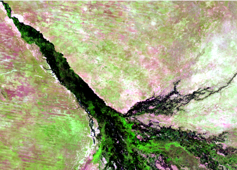 This second view focuses on the biological health of the delta using a classic "False Colour Infrared" representation. By assigning Band 5 (Near-Infrared), Band 4 (Red), and Band 3 (Green) to the red, green, and blue colour guns, we can see the landscape through the lens of vegetation productivity. To make these colours as clear as possible, a Linear 2% Stretch was applied to maximize colour saturation. This view is particularly effective because healthy plants reflect Near-Infrared light very strongly, causing the lush papyrus and grasses of the delta to glow in vibrant shades of red. This colour contrast allows us to easily tell the difference between different environments, where permanent swamps appear as deep reds and seasonal floodplains show up as lighter pinks. Additionally, the deep water in the main channels absorbs most light and appears nearly black, creating a sharp, high-contrast boundary against the surrounding red vegetation.