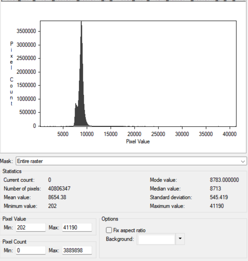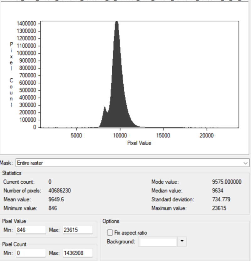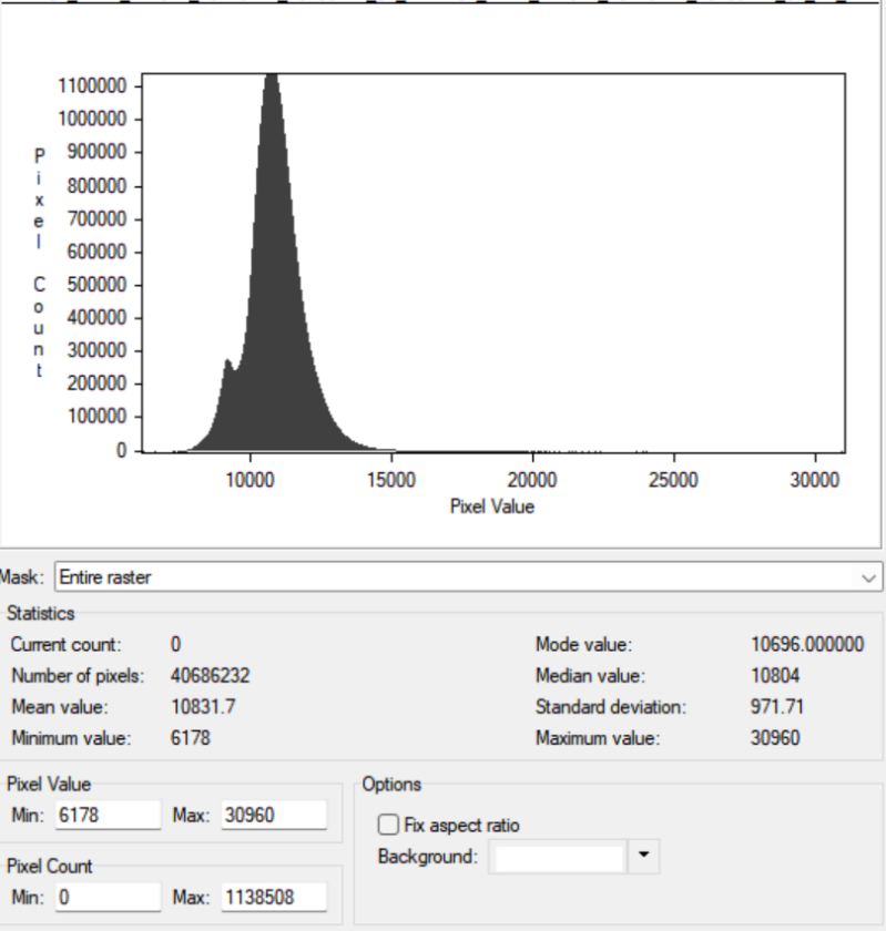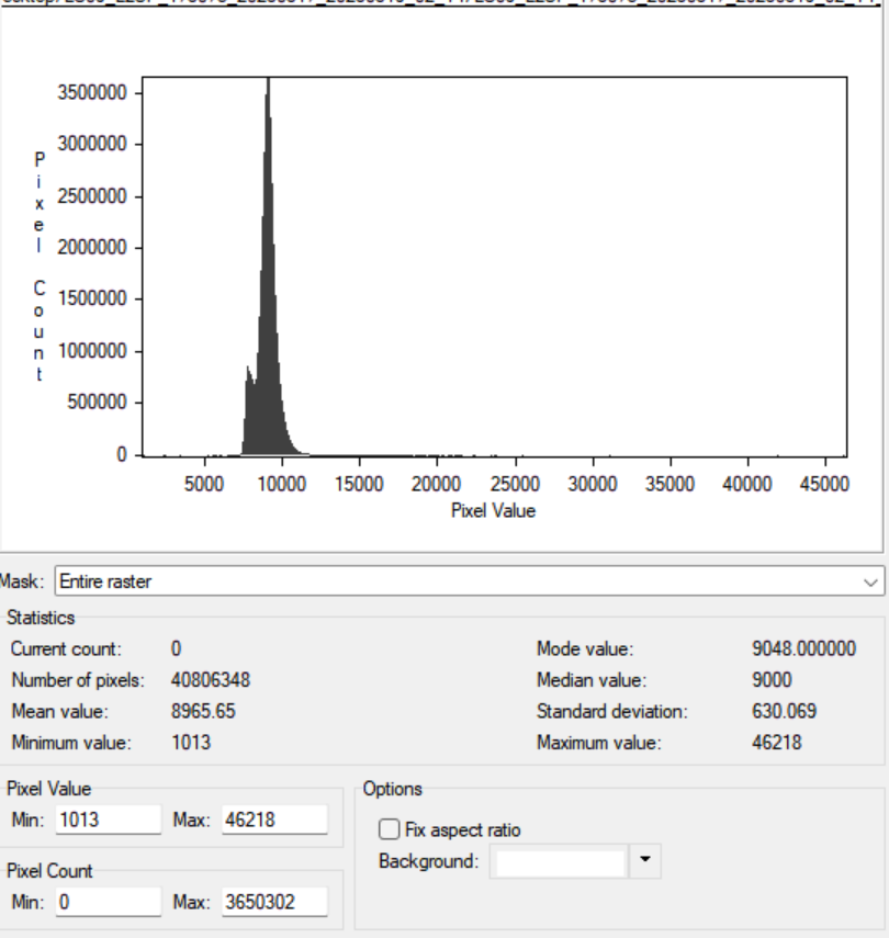 To describe the Landsat 9 Coastal Aerosol band (Band 1), we first look at the basic image statistics and the distribution shown in the histogram. The dataset contains over 40 million pixels with a mean value of 8654.38 and a median of 8713. The histogram shows a very narrow, tall peak concentrated between the values of 7500 and 10000, which indicates that most of the image has very similar brightness levels. While the total range of possible values for this 16-bit data is quite large, the actual data is "bunched up" in a small area, which is why the original image appears dark and lacks clear detail. The presence of a small secondary peak on the left side of the main spike suggests there are some distinct features, likely darker areas like water or deep shadows, but they are not easily visible in the current state. Because the data is so tightly clustered, the visual quality of the image is poor. To fix this, a contrast enhancement or linear stretch is necessary. By stretching the narrow range of values (roughly 7000 to 11000) to fill the entire display range, we can bring out the hidden details in the landscape. This is a common step in remote sensing because it makes it much easier for the human eye to distinguish between different types of ground cover. Without these enhancements, the subtle differences in the Coastal Aerosol band remain hidden, making the data difficult to interpret for any real-world mapping or analysis.